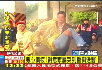據臺灣TVBS電視臺報道,蘇花公路搜救行動已進入第7天,20名失聯大陸游客的任何消息都牽動著他們家屬的心。焦急等待的心情加上惡劣氣候,使得一名創意旅行社失聯大陸游客家屬在今(27)日中午哭到昏倒,送醫救治。