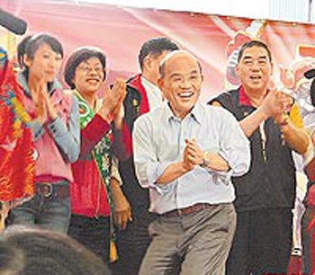 中新網(wǎng)11月14日電 民進(jìn)黨臺北巿長候選人蘇貞昌13日出席松山霞海城隍廟活動,受邀與五路財神一起跳Nobody舞,但他脫了西裝外套,跳出來的舞步卻是Sorry Sorry舞,現(xiàn)場high翻天。