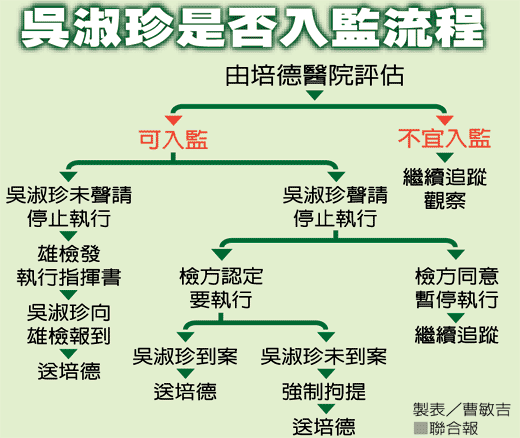 高雄檢方昨天進(jìn)行沙盤推演,如果評估可以入監(jiān)服刑,傳票最快在本月下旬發(fā)出,但最棘手的情況是吳淑珍屢傳不到,檢方必須執(zhí)行拘提。