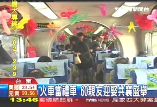 中新網12月8日電 臺灣臺南有一位鐵道迷,為了要完成在火車上結婚的夢想,自掏腰包花了4萬多元新臺幣,包下臺鐵行政專車,載著60多名的親友,從樹林迎娶新娘回臺南林鳳營站;疖嚮槎Y堪稱臺灣史上頭一遭,月臺上吸引很多乘客目光,也造成轟動。