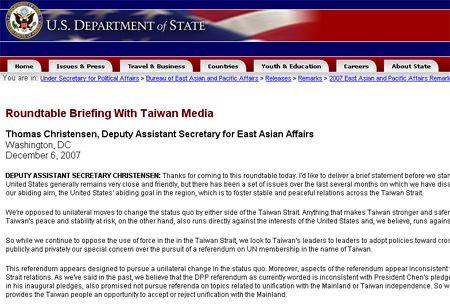 柯慶生首先發(fā)表一份聲明說,美國曾私下和公開表明反對“以臺灣為名義加入聯(lián)合國的公投”,因為美方認為這代表追求單方面改變現(xiàn)狀,違反陳水扁初次就職演說的承諾,包括不更改“國號”和不會推動“統(tǒng)獨公投”。