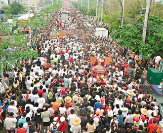 中新網4月14日電 經過八天七夜繞境出巡,臺灣大甲媽祖神轎昨天回鑾到臺中縣大甲鎮。超過十萬名接駕信眾綿延十多公里。信眾的熱情,讓回鑾的預定時間比去年更延遲好幾個小時,家家戶戶備妥香案跪拜,鎮瀾宮深夜十一點舉行安座大典,場面盛大熱情。