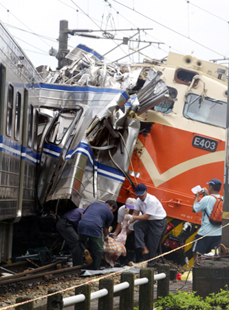 宜蘭大里6月15日發生火車撞火車重大事故,試運列車攔腰撞上通勤電車,造成5死16傷,救難人員將車廂中罹難旅客搬出。記者曾吉松/攝影