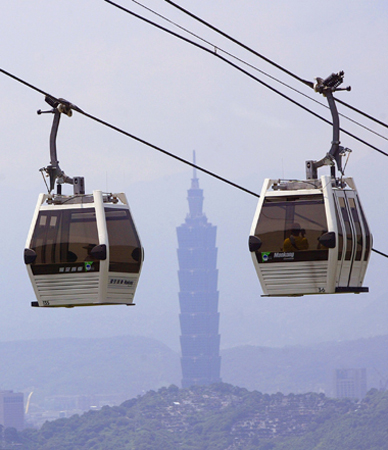 雖有打雷閃電停駛、當機,以及悶熱的不良現象,大家還是無法抵擋高空美景誘惑,臺北貓空纜車7月營運以來已有200萬人次搭乘。圖為貓纜遠眺臺北101。記者周永受/攝影