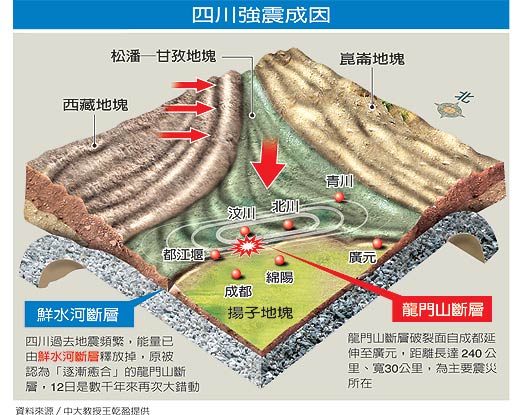 中新網5月16日電 據臺灣《聯合報》報道,臺灣“中央大學”地球科學系教授王乾盈說,四川強震成因被認為“漸歸沉寂”的龍門山斷層“復活”發生錯動,這個斷層自明朝以來被紀錄到動的數據不多;十二日的錯動使當地地殼抬升九公尺,“喜馬拉雅山長高好幾公尺”。