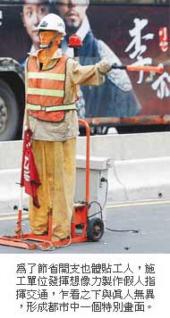 除了假警察之外,施工單位也常常擺出手持指揮棒的假工人,藉以提醒車輛改道,除了可以節省人力,還可以避免因駕駛人不慎造成的人身傷亡。