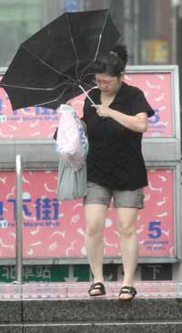 “鳳凰”臺風(fēng)來襲,臺北市街頭不時出現(xiàn)強(qiáng)風(fēng)讓路過行人手中的雨傘直接開花。