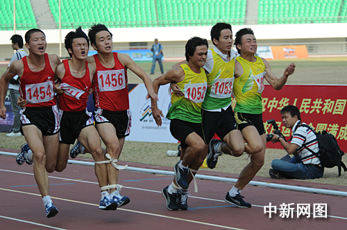 中新網泉州10月28日電 (劉通)全國農運會田徑項目今日在福建泉州開戰。圖為在下午舉行的農運會60米三人四腳比賽中,寧夏代表團選手(左)表情“痛苦”地在賽道上飛奔。