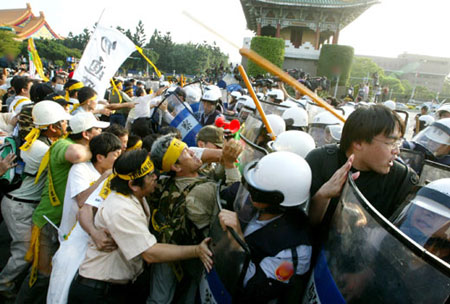 民進(jìn)黨人士在陳云林訪臺期間“圍城游行”,與警察爆發(fā)多次沖突。