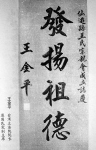 圖:王金平為福建莆田仙游王氏宗親會成立題詞