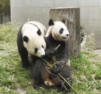 大陸送臺灣的大熊貓逃過一劫,團團(左)搶吃圓圓的竹子,十分恩愛。