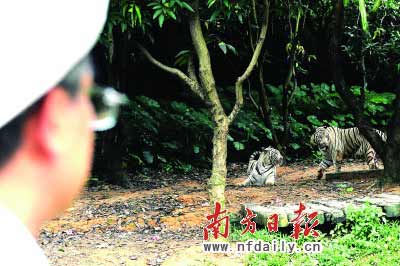 準備送給高雄的兩只白虎為一公一母,公的叫“昭海”,母的叫“歡樂”。看到客人來了,“昭海”和“歡樂”不時站起來走幾步,秀秀身材;又不時把臉朝向觀眾,配合鏡頭。訪問團成員紛紛站到鏡頭前,與兩只白虎來個“遠距離合照”。