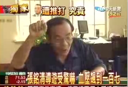 海協(xié)會(huì)副會(huì)長(zhǎng)張銘清在臺(tái)遭襲事件,不但令國際震驚,就連臺(tái)南人自己也被嚇了一大跳。據(jù)臺(tái)灣中時(shí)電子報(bào)23日消息稱,當(dāng)天擔(dān)任張銘清在孔廟的導(dǎo)游的江文章,說自己當(dāng)時(shí)被嚇得腦袋一片空白,后來量血壓,竟然發(fā)現(xiàn)血壓飆高到170。
