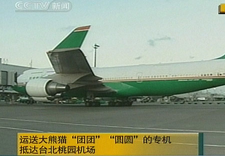 中新網(wǎng)臺(tái)北12月23日電 今天下午17時(shí)03分左右,大陸贈(zèng)臺(tái)大熊貓“團(tuán)團(tuán)”、“圓圓”搭乘長(zhǎng)榮航空公司波音747專機(jī)飛抵臺(tái)北桃園機(jī)場(chǎng)。