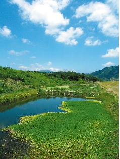 新良濕地的水源來自灌溉溝渠末端余水,從排水圳流入濕地,高度有些落差形成一個小瀑布,濕地里分有6片區塊,大王蓮占其中一塊。