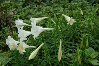 環島公路白沙到馬蹄橋路段、海參坪到綠島朝日溫泉,以及通往觀音亭的公路旁山壁,都是賞百合地點,野百合一簇簇在巖壁上迎風搖曳。而在島上步道綠林間,還有玉葉金花、黃槴與華八仙等植物伴隨百合展露花容。