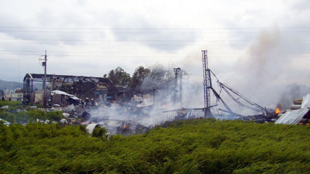 消防人員冒著大火到火場內灌救,火場不斷傳出小型爆炸,十分嚇人,而現場馬路上都布滿工廠飛出的鐵皮與鋼架,連附近民家玻璃屋頂都震破得十分嚴重,滿目所見都是殘破現象,還有一位傷者震飛到三十多米的稻田草叢中,是被到場記者聽到哀嚎聲才通報搶救,現場慘不忍睹。