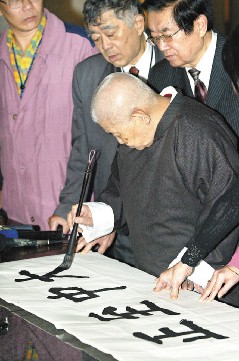 六歲習(xí)字,曾在“總統(tǒng)府”為蔣介石寫(xiě)帖子、格言,50多歲開(kāi)始教授書(shū)法的楊家麟,昨天在學(xué)生簇?fù)硐拢檬帜ㄆ叫垼瑵?rùn)潤(rùn)筆,凝氣重新寫(xiě)下“大中至正”,就跟掛在牌樓上近30年的字體一模一樣。