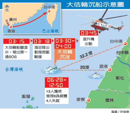 臺灣搜救中心指出,昨天凌晨三時十五分,接獲臺中海巡單位轉報大佶輪發出求救訊號,即指揮臺中海巡隊出動巡防艇于三分鐘后馳往;凌晨四時,大佶輪完全沉沒,在雷達幕上消失。