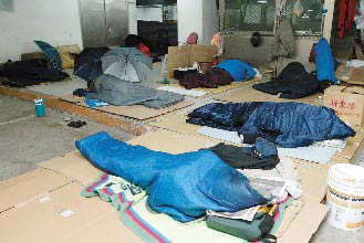 中新網2月15日電 寒流連日來襲,臺北市一度掉到攝氏六七度,使得大批游民涌入臺北火車站避寒。原本約僅數十名游民“駐地”的臺北火車站,這幾天一下子爆增到兩百多人。不少游民用厚紙板搭成簡陋帳篷御寒,雜物散置一地,使得臺北火車站一些角落仿佛“難民營”。