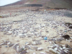 全鄉(xiāng)只有四千余人的望安,是由十八個島嶼組成,但除了望安本島外,其它都是無人島。洪嬡慧說,從春節(jié)以后望安的海灘上就開始出現(xiàn)死魚,最初還有不少民眾撿拾,專挑大尾的或還有口氣的,有些人一天可撿一百多公斤;但這兩天海灘上的魚都死了,已不再有民眾撿拾,因此是遍地魚尸,讓人寸步難行,只能用慘不忍睹形容。