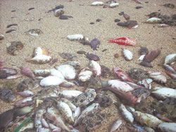 中新網(wǎng)2月18日電 據(jù)臺灣中國時報報道,四面環(huán)海的澎湖望安離島,連日來四周海灘布滿了魚尸,望安“國中”校長洪嬡慧表示“太可怕了,三、四百公尺長的海灘全是魚尸!彼f,望安有七個海灘,只走了兩處海灘,情況都一樣嚴(yán)重,希望當(dāng)局相關(guān)單位趕緊處理,否則會對環(huán)境帶來災(zāi)難。