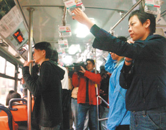 周美青上車(chē)時(shí),媒體跟著蜂擁上車(chē),公交車(chē)司機(jī)嚇了一大跳,嘴巴張得開(kāi)開(kāi)的合不攏。上車(chē)時(shí)沒(méi)座位,周美青站著,像一般上班族戴上mp3聽(tīng)音樂(lè);到快下車(chē)前,才有個(gè)空位坐下。