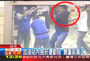 中新網10月20日電 據臺灣TVBS報道,臺北市文化大學附近一家加油站,有一群飚車族到加油站加油,其中一名男子抽煙被勸阻,覺得沒面子,竟然和同伴圍毆加油站員工,監視器也拍下整個過程。