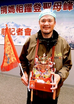 中新網(wǎng)3月17日電 據(jù)臺灣《聯(lián)合報》報道,臺灣登山好手李小石計劃背負(fù)馬祖天后宮媽祖金身攀登世界最高峰珠穆朗瑪峰,16日出發(fā),連江縣長與上百鄉(xiāng)親到桃園機場送媽祖啟程,為李小石加油打氣。