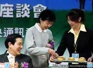 馬英九去年在晚宴張大嘴咬紅豆餅的一張照片,成為經典的新聞照片,因為夫人周美青還在旁皺眉瞪眼,這張照片后來被馬英九收藏起來,掛在辦公室,還加注一句圖說“我怎么嫁給這樣的人!”