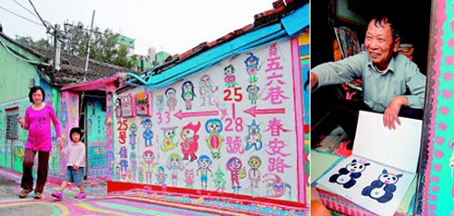 中新網4月7日電 據臺灣《聯合報》報道,臺中市有處五彩繽紛的彩繪眷村,墻面、地板畫滿人像、動物與色塊,夢境般場景吸引大批博客、攝影玩家,孤寂的眷村頓時熱鬧起來;這些圖畫都出自86歲退伍老兵黃永阜之手,他說,畫圖是排遣無聊,沒想到大家喜歡,讓他越畫越起勁。