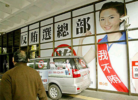 臺灣兩大選舉即將來臨之際,為宣示查賄決心,檢警部門連手吸收政風人員及網民全臺布雷搜集情資,各處檢調單位也掛出大型反賄選海報。《中國時報》圖 林勝發 攝