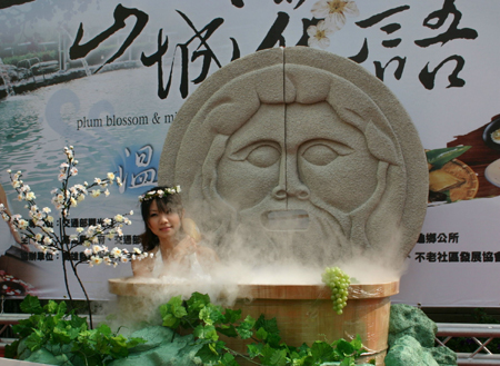 臺(tái)灣高雄縣溫泉餐飲業(yè)者推出“山城花語(yǔ)溫泉季”活動(dòng),四日記者會(huì)中的辣妹泡湯,凸顯活動(dòng)主題。“中央社”圖 陳守國(guó) 攝