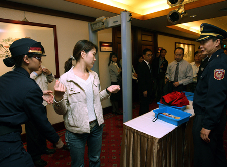 臺灣當局“國安”單位近來加強安全工作。圖為陳水扁十三日出席公開活動時,出席人員連外套都須脫下檢查。“中央社”圖 郭日曉 攝