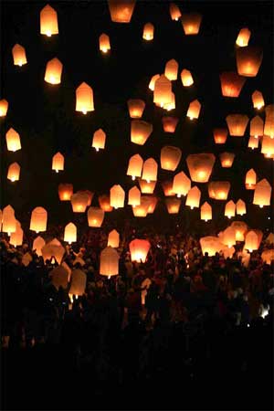 臺北縣平溪國際天燈節十六日晚間展開首波活動,平溪中學天燈會場吸引數千名的民眾燃放天燈,圖為天燈冉冉升起,將大家愿望飄向天際。《中國時報》圖 劉英純 攝