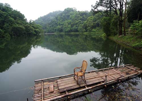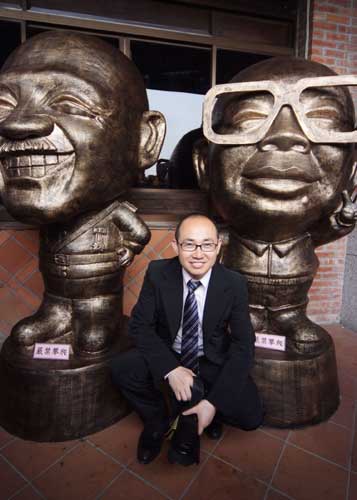 大陸房地產(chǎn)訪問團(tuán)二十二日參訪臺灣桃園后慈湖,SOHO中國公司董事長潘石屹認(rèn)為后慈湖與九寨溝相像,環(huán)境極美。他對兩蔣Q版玩偶也感到很好奇,并留影紀(jì)念。“中央社” 圖 邱俊欽 攝