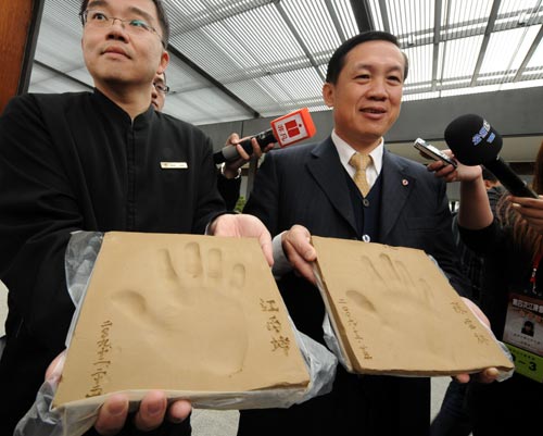 陳云林臨行前與海基會董事長江丙坤在涵碧樓留下陶土手印作為紀念。(圖:中央社)