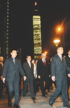 韓正于當(dāng)日晚間還登上世界第二高樓臺(tái)北101大廈,其間更巧遇101大廈燈全亮,韓正贊“臺(tái)北夜景漂亮”。