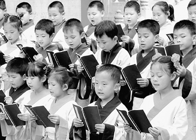 5月15日,“兩岸漢字藝術節”新聞發布會在北京孔廟舉行。圖為學童們在誦讀《弟子規》。記者 孫立極攝