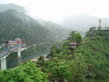 大約10分鐘,就爬上了觀音臺(tái)。觀音臺(tái)立有一座四十尺高,以青銅鑄造的觀音圣像,下方另一平臺(tái),有一圓頂?shù)牡钐茫敕钣^音神像。觀音臺(tái)上,居高臨下,眺望遠(yuǎn)近山水,俯瞰坪林聚落,景色怡人。觀音臺(tái)步道沿途亦無(wú)遮蔭,陰涼天氣或雨中來(lái)訪皆宜,惟不宜艷陽(yáng)高照日。