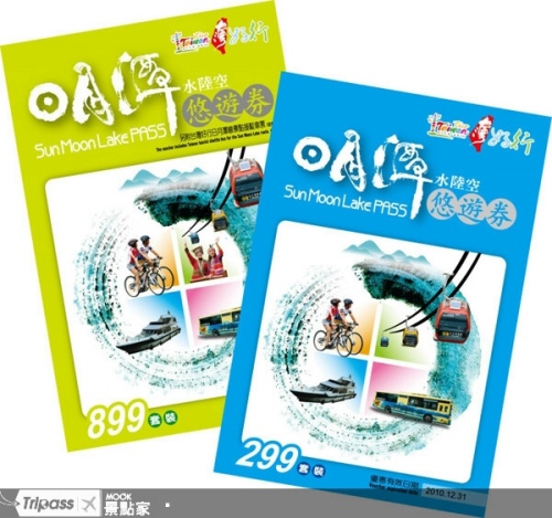 日月潭水陸空悠游券分為299元藍色套裝6合1優惠,包括纜車票、水社到伊達邵船票(單趟)、環潭巴士1日票、捷安特單車1小時免費體驗券,和電動車租車8折券,游客到寺廟蓋紀念章,還可以兌換日月潭的獨特紀念品。若是需要臺中至日月潭交通接駁的游客,可選擇899元的綠券,除了藍券優惠外,再包含臺中至日月潭的臺灣好行景點接駁來回票,以及九族文化村門票。