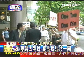 而飯店里的挺馬僑胞也不停在喊支持口號,才讓馬英九開心地笑了,挺馬僑胞的歡呼聲一時間蓋過了場外的嗆聲。而反馬僑胞仍舊拼命表演,手上高舉“ONE TAIWAN ONE CHINA”的“臺獨”標語,徹底惹毛了飯店2樓的挺馬僑胞,忍不住沖下了樓,戰火一觸即發。