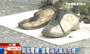 據(jù)臺(tái)灣TVBS電視臺(tái)報(bào)道,臺(tái)南縣一名小偷潛入歇業(yè)的工廠偷電纜,意外發(fā)現(xiàn)變電器箱里竟有一具白骨。據(jù)臺(tái)灣警察分析,死者可能是要偷電纜意外觸電,死亡時(shí)間超過2年;發(fā)現(xiàn)白骨的竊賊,也因?yàn)榱粼诂F(xiàn)場,通緝犯身份曝光,被帶回警局。