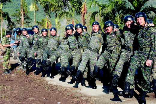 中新網8月25日電 據臺灣《聯合晚報》報道,救災臺軍官兵傳出甲型流感疫情后,民間捐贈的防水透氣材質特戰軍靴25日清晨起由直升機運至第一線山區救災部隊官兵手中,在馬英九巡視高雄縣那瑪夏鄉民族、民權、民生等村落前,執行救災任務的25名海軍陸戰隊官兵都趕忙換到新靴子。