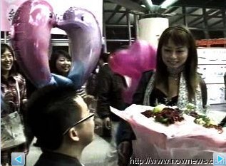 “親愛的德慧,謝謝你!因為有你,我的人生變得多彩多姿,完整而美麗,未來的日子,我想用一輩子的時間來好好疼愛你、照顧你,請你嫁給我好嗎?嫁給我好嗎?”一看到女友羅德慧搭著手扶梯出現(xiàn),男主角林志緯立刻求婚,而一邊的親友團也忙著敲邊鼓,舉海報的與拿氣球的全忙著卡位,還高喊“嫁給志緯,幸福滿分”的口號。