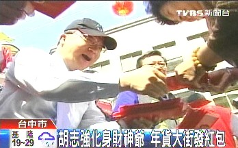 再過幾天就是農(nóng)歷春節(jié),臺中天津路年貨大街為了增加人氣,請胡志強發(fā)紅包,民眾大排長龍,不少小朋友領(lǐng)到市長紅包,嘴巴也變甜了,“祝市長新年快樂,年年有余,大吉大利!”還有一位阿伯為了見到胡志強,連續(xù)3年都來領(lǐng)紅包。