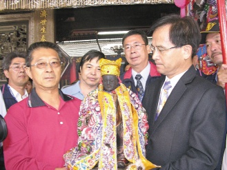 臺南縣學甲慈濟宮開基保生二大帝安南巡禮,800多年歷史的神像由縣長蘇煥智(右一)、慈濟宮董事長周尚德(右二)請出。 聯合報圖