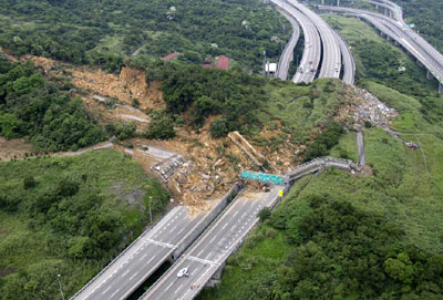 據悉,山崩地點范圍從北二高南下3.1公里至北上2.8公里處,土石覆蓋雙向路面的長度達300米,土石量總重超過20萬立方公,南北交通中斷。