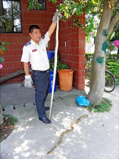 中新網5月19日電 據臺灣媒體報道,大蛇吃小蛇,消防人員前晚捕捉2米長的臭青母時,它竟吐出肚中1米長的小臭青母,“抓一條送一條”十分罕見。