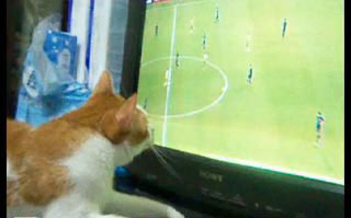 中新網6月22日電 據臺灣“今日新聞”報道,2010世界杯足球賽不僅是全球人們關注的焦點,連貓咪也喜歡,據了解,臺灣一只名叫加菲(GARFIELD)的貓咪,竟然緊貼在電視機前,無比專注地盯著轉播,還會激動地伸出貓爪,對著熒幕又拍又打。